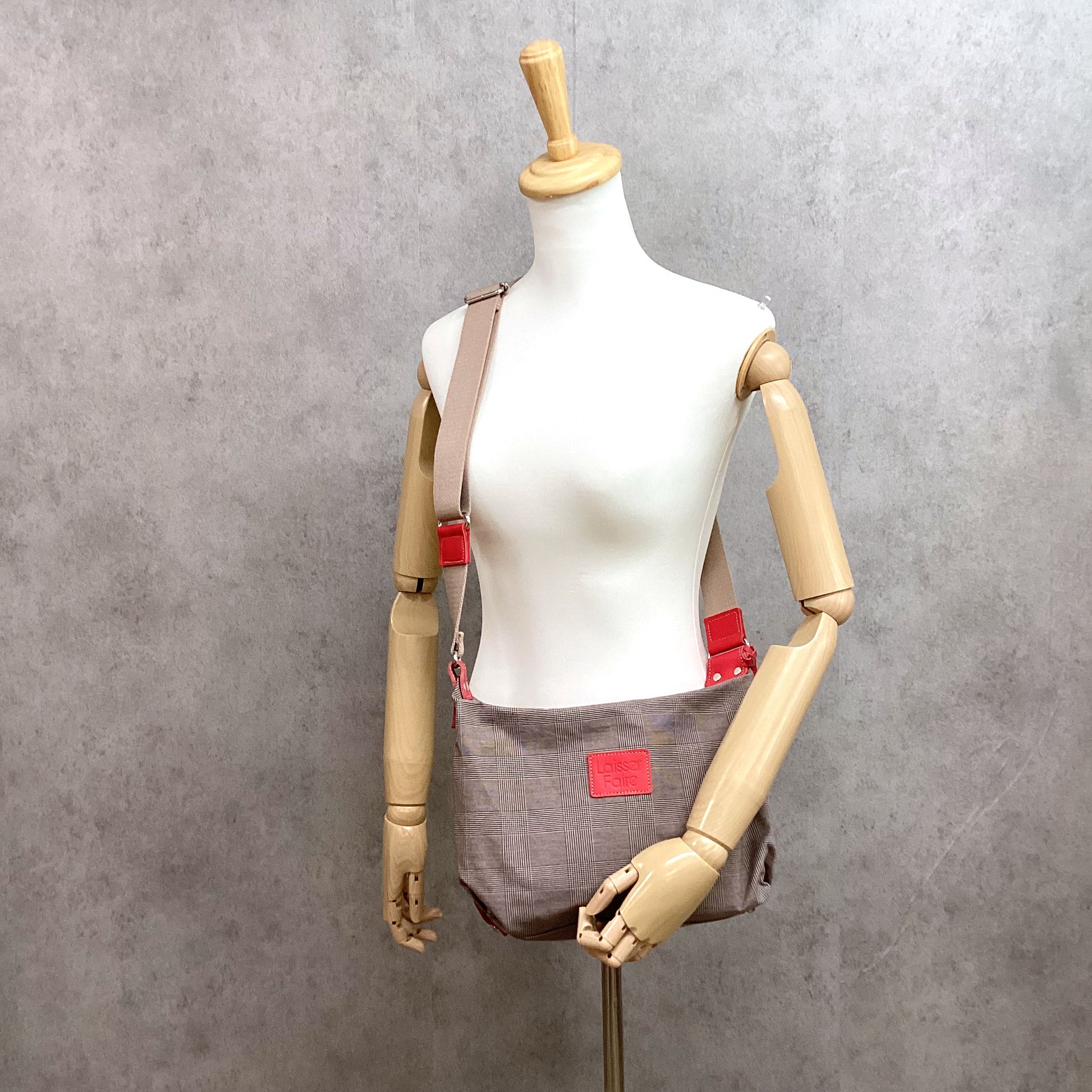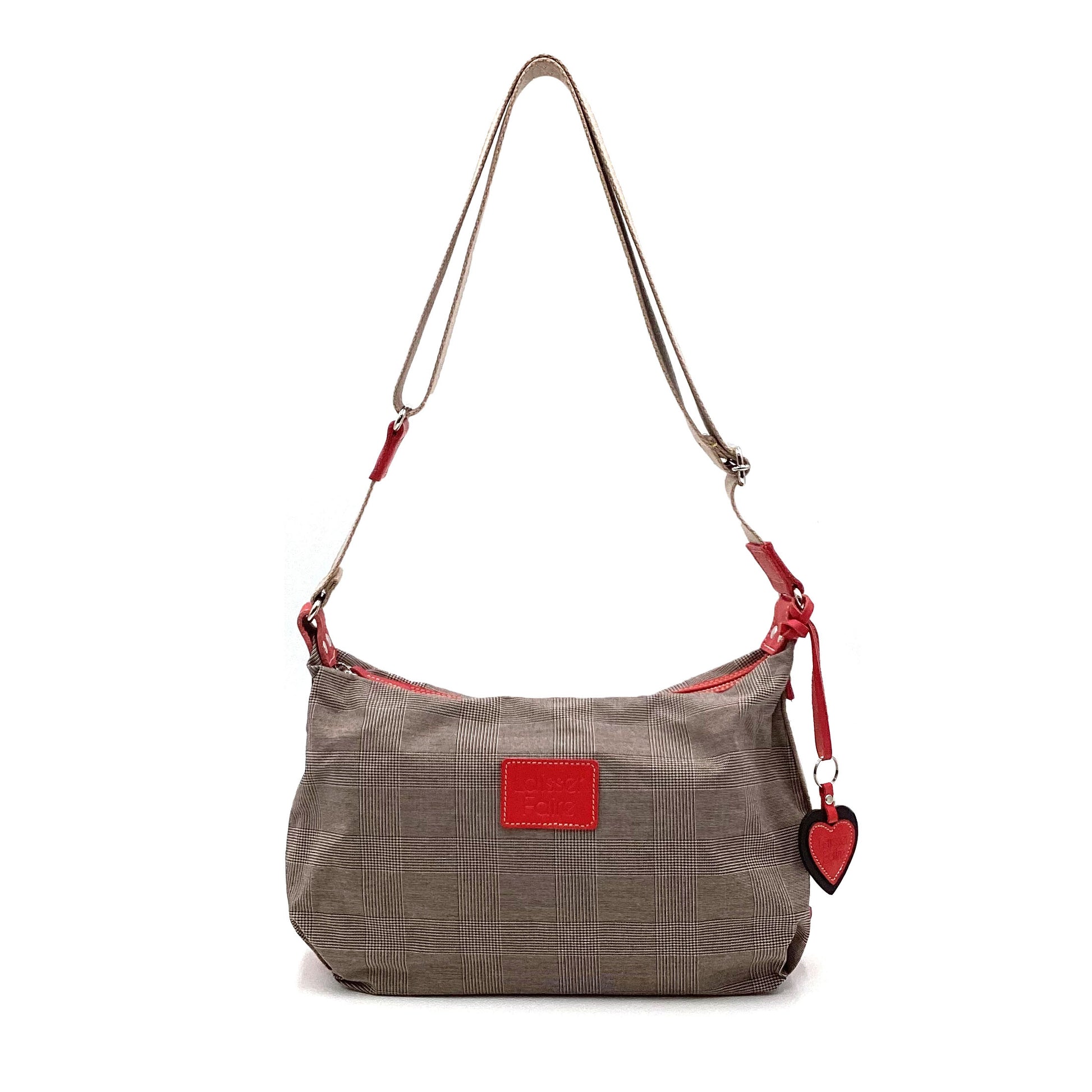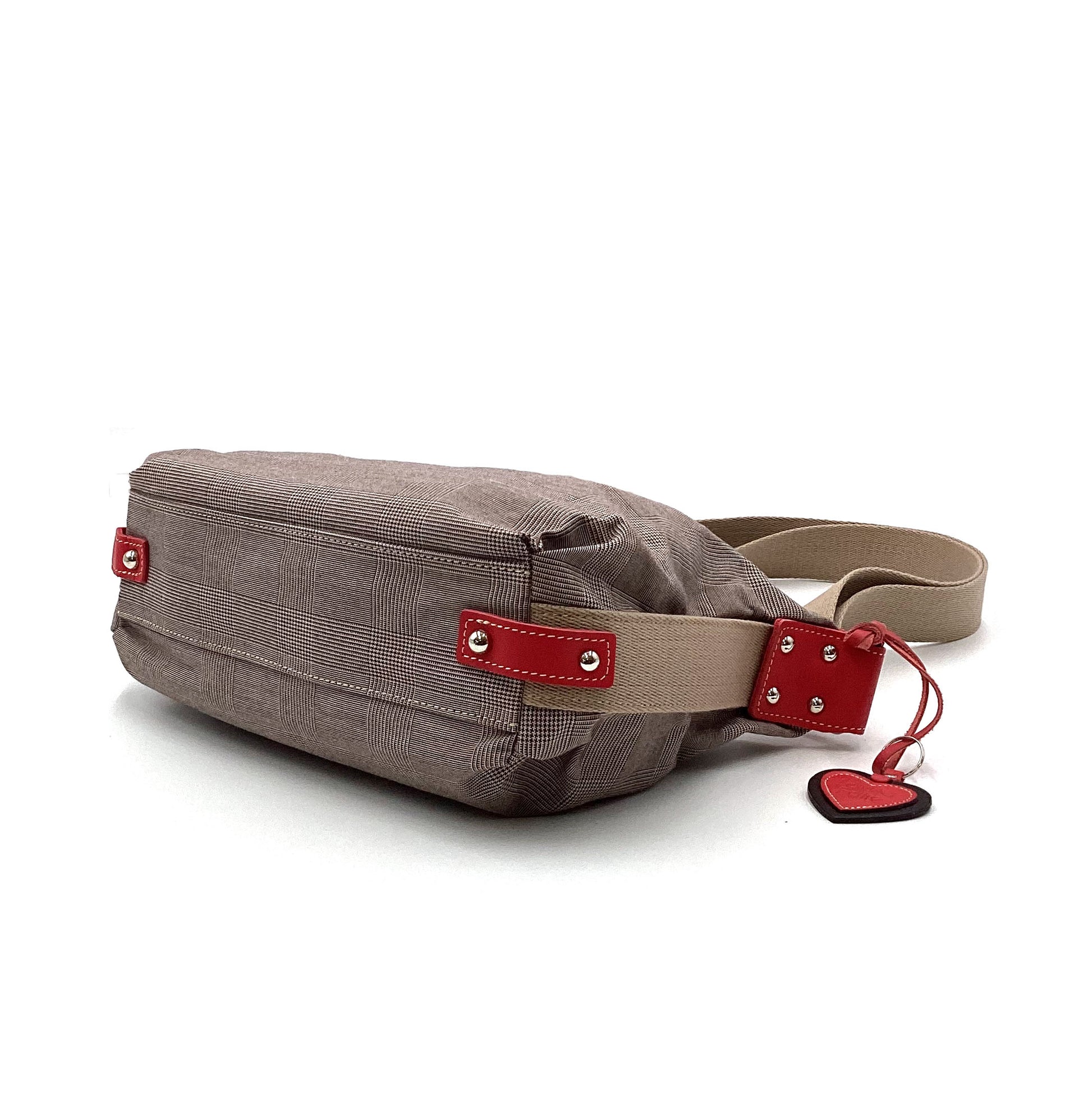 グレンチェックに合わせたアクセントカラーが目を惹くシリーズ。上品に、でも遊び心も忘れずに。牛革に型押しを施したハート型のチャームつきです。程よい厚みのさらりとした生地と、本革のディテールから、大人のきちんと感が伝わります。