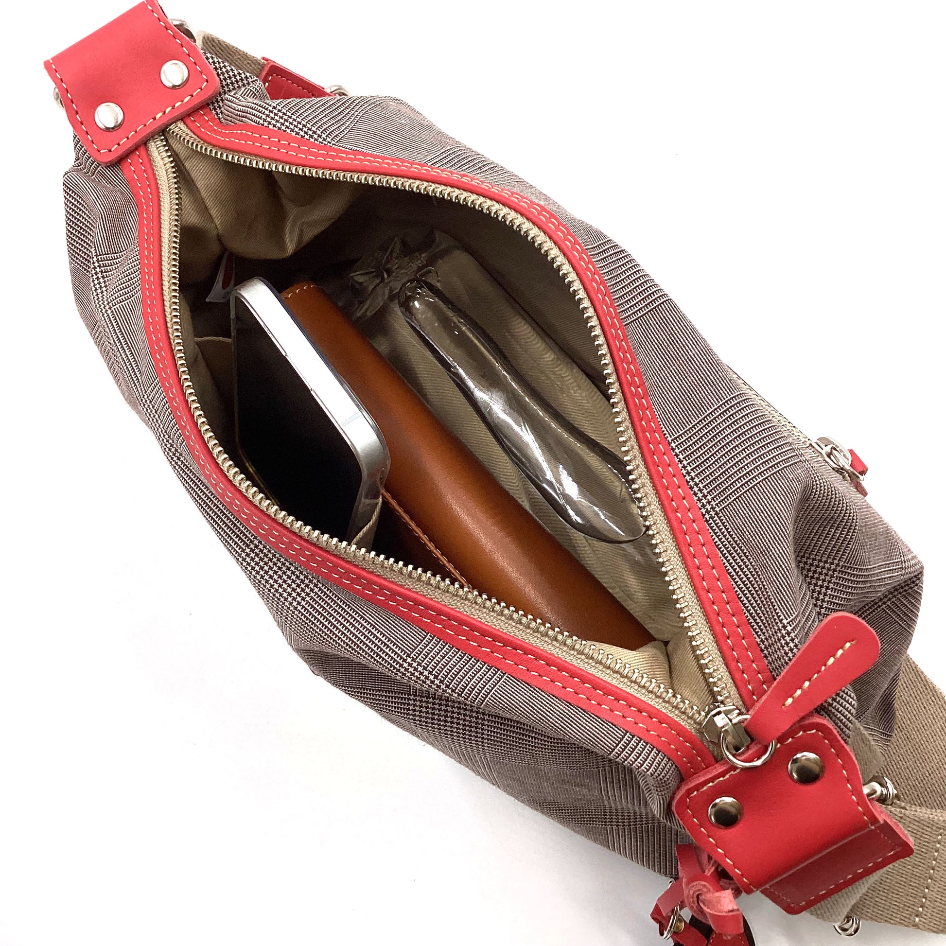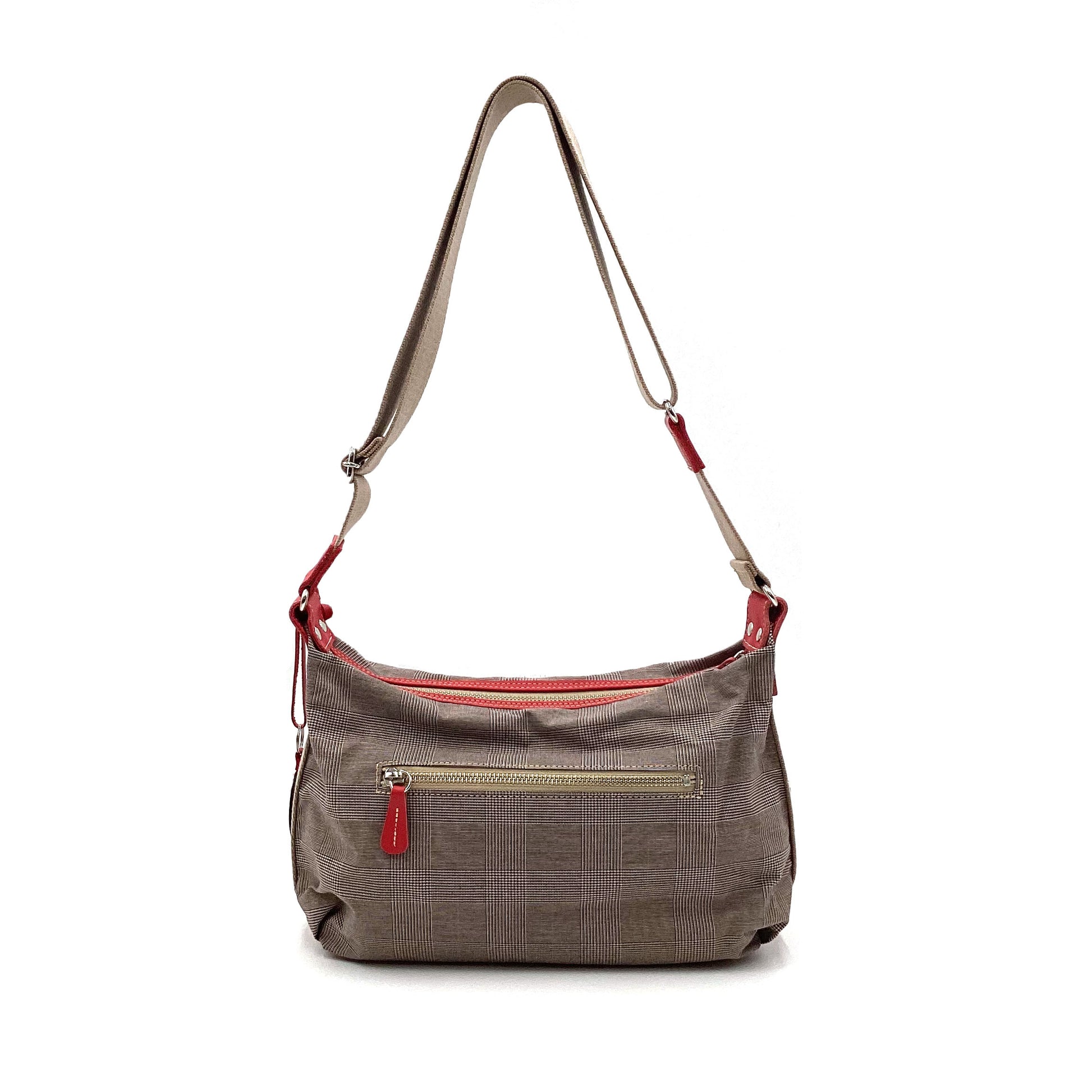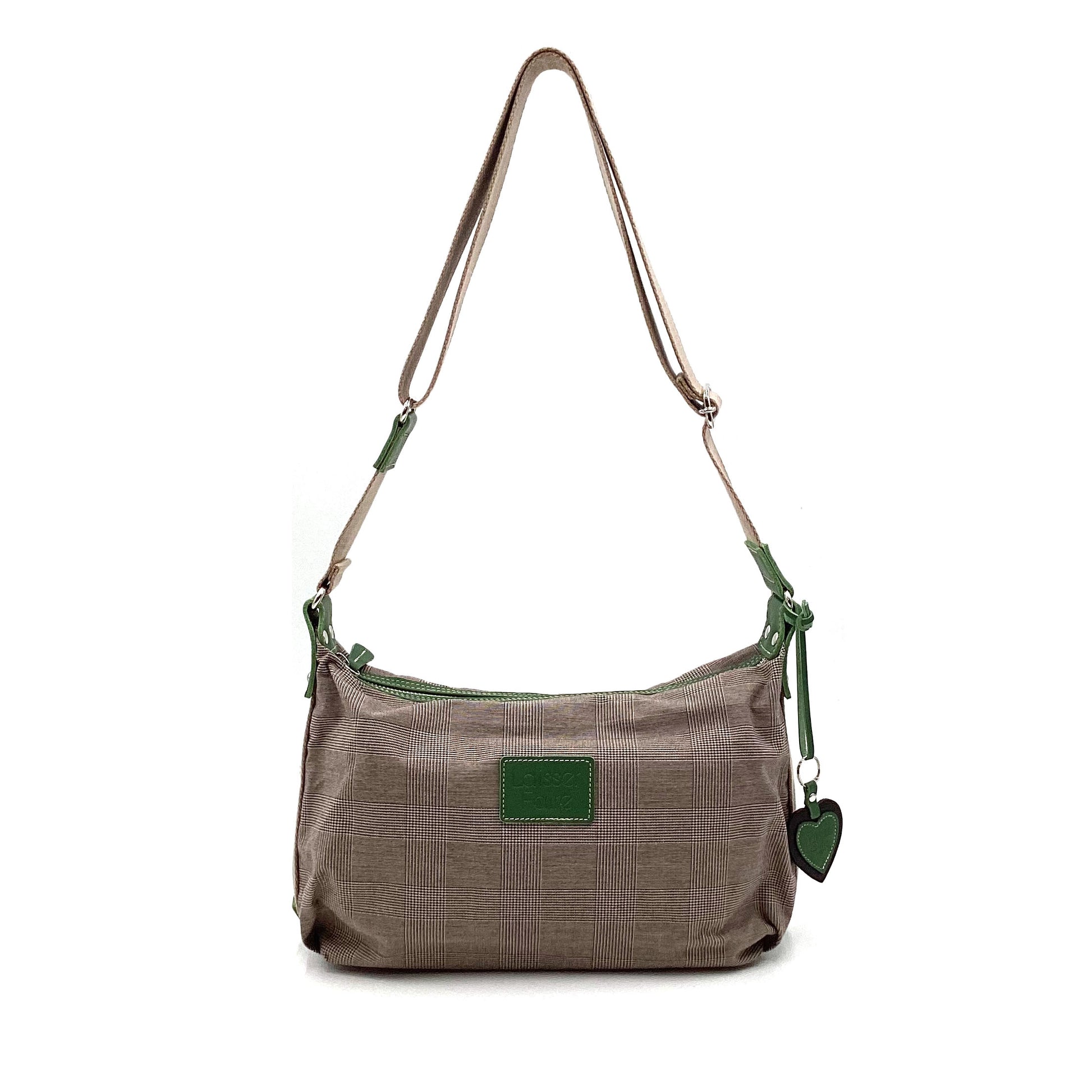 グレンチェックに合わせたアクセントカラーが目を惹くシリーズ。上品に、でも遊び心も忘れずに。牛革に型押しを施したハート型のチャームつきです。程よい厚みのさらりとした生地と、本革のディテールから、大人のきちんと感が伝わります。
