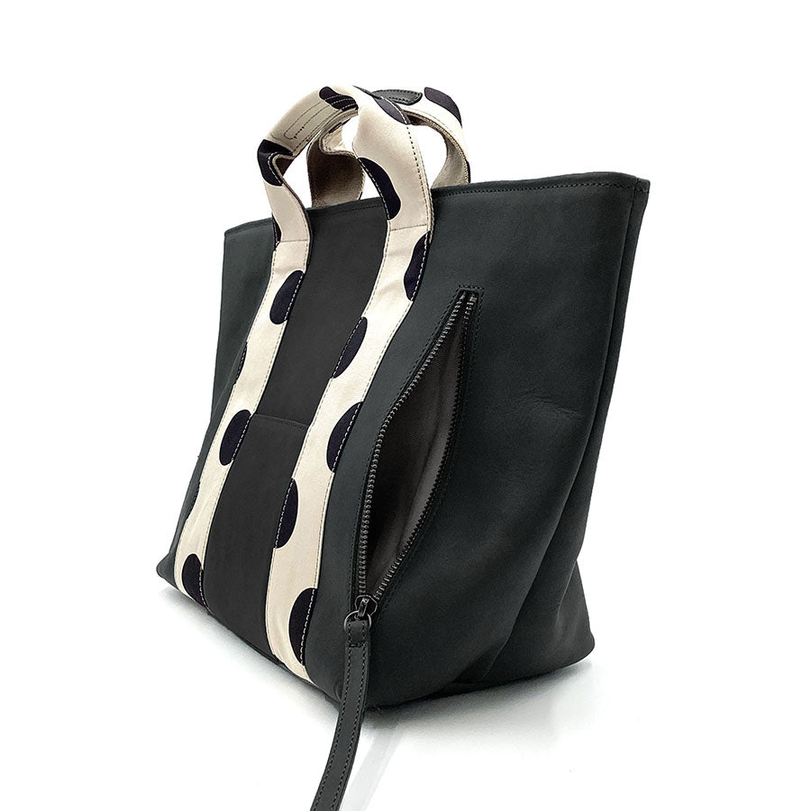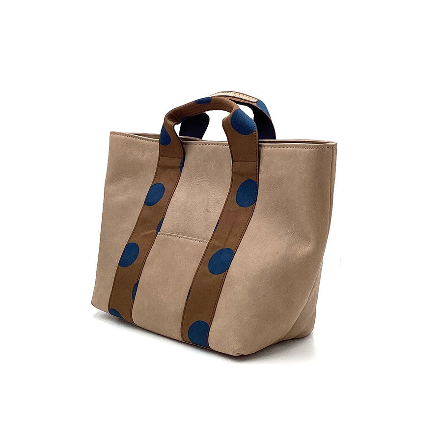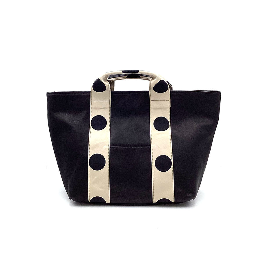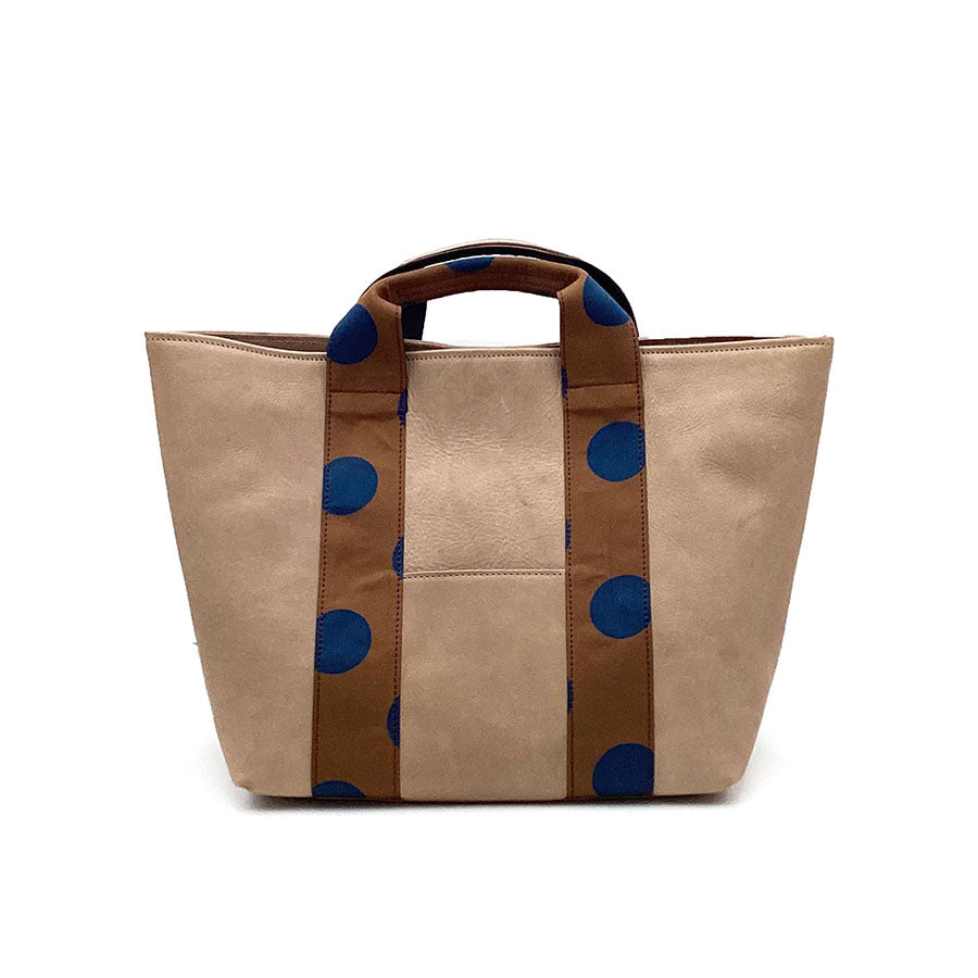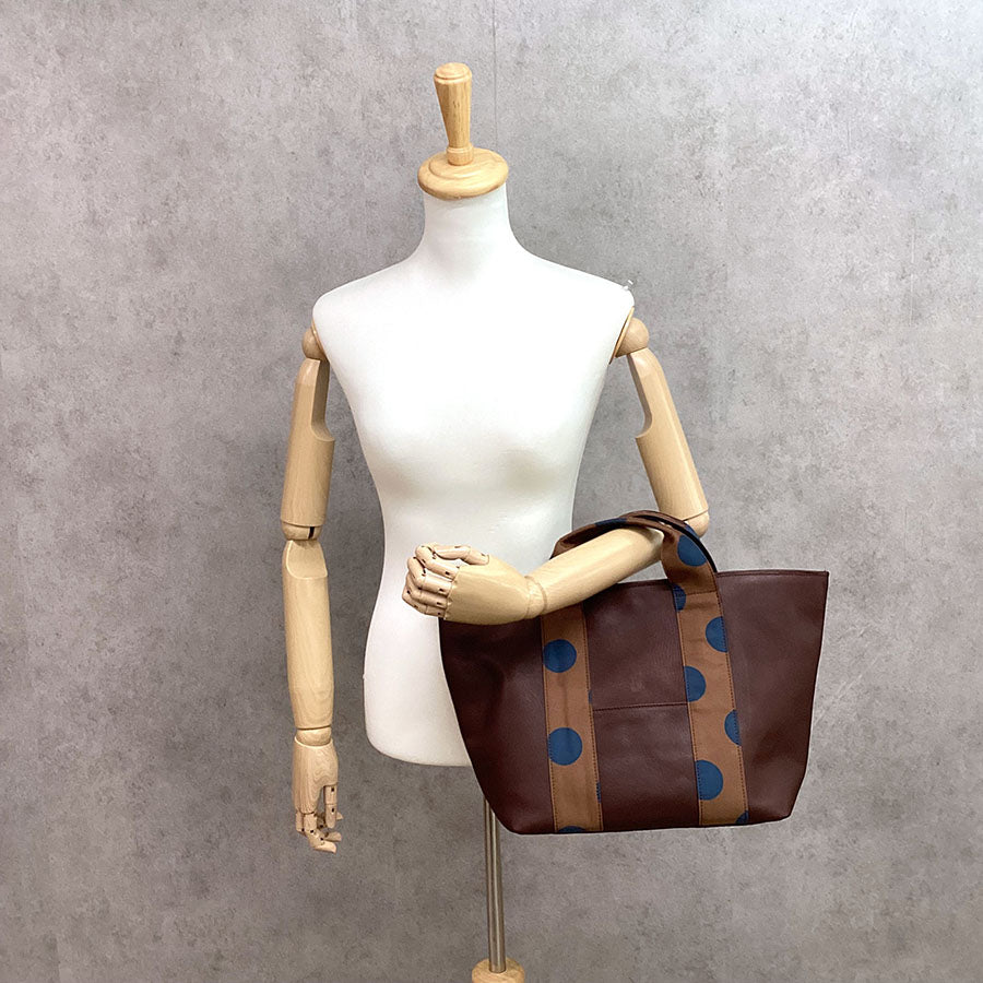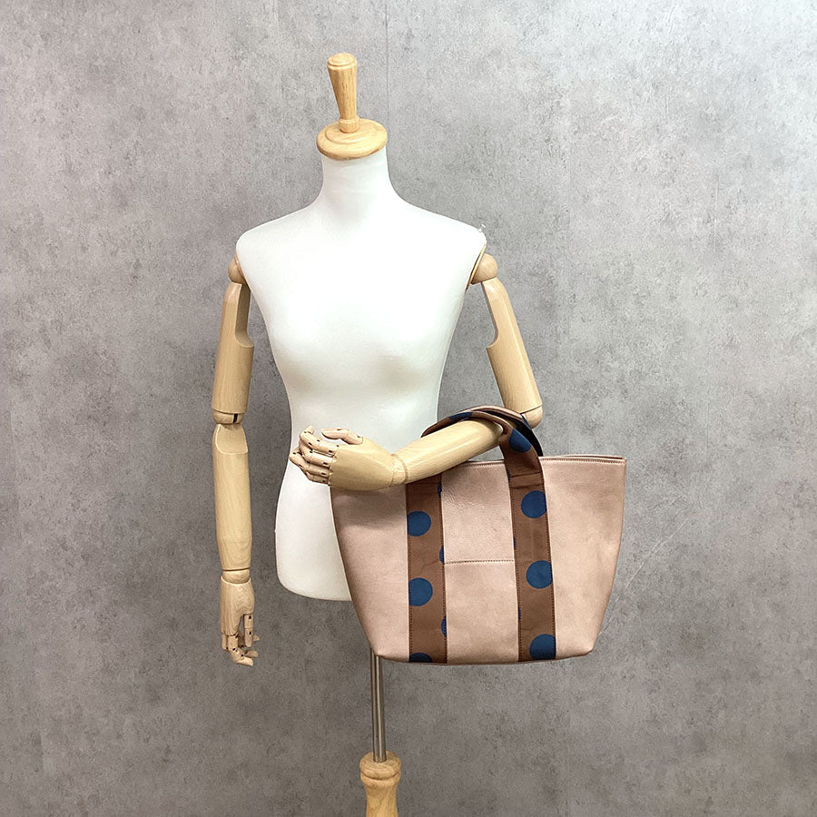 ドット柄テープがアクセントになったハンドバッグ。本体には、マットな質感が美しい牛革を使用。自然な濃淡やツヤ感が楽しめる、表情豊かな素材です。本体をシンプルなデザインにすることで、ドット柄のテープを引き立たせ、カジュアルにもきれいめにも合わせやすいアイテムに仕上がりました。