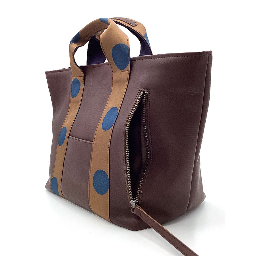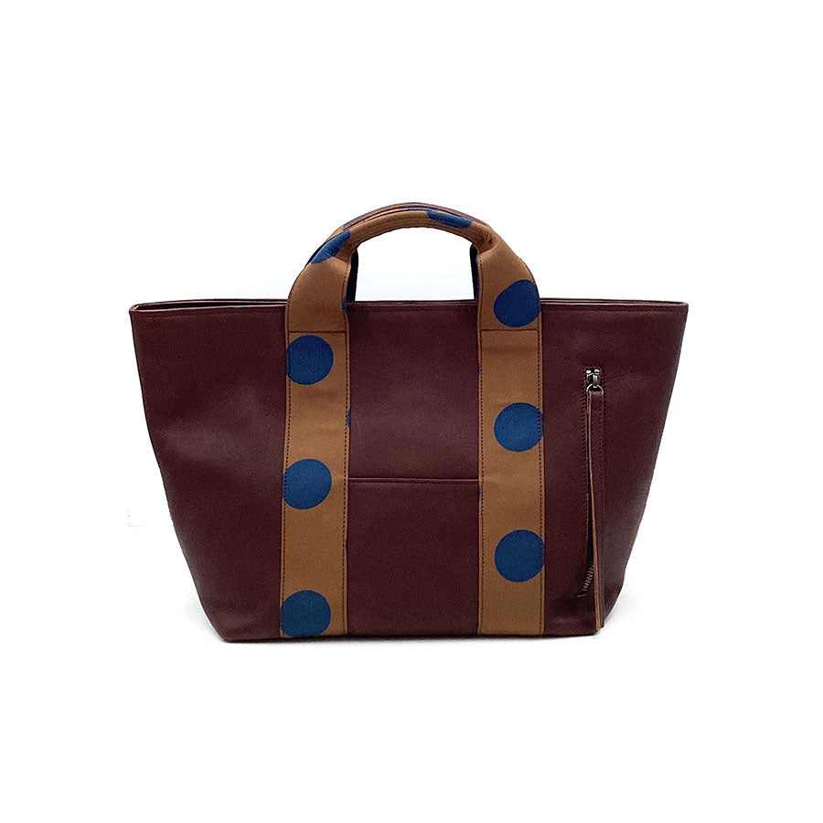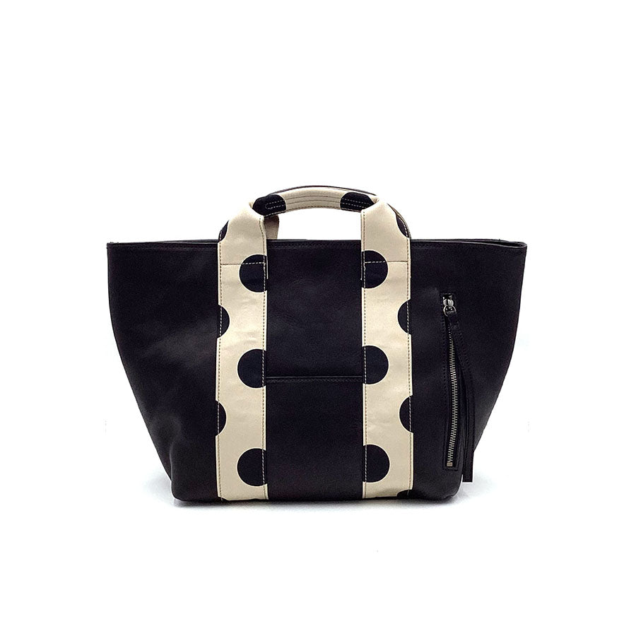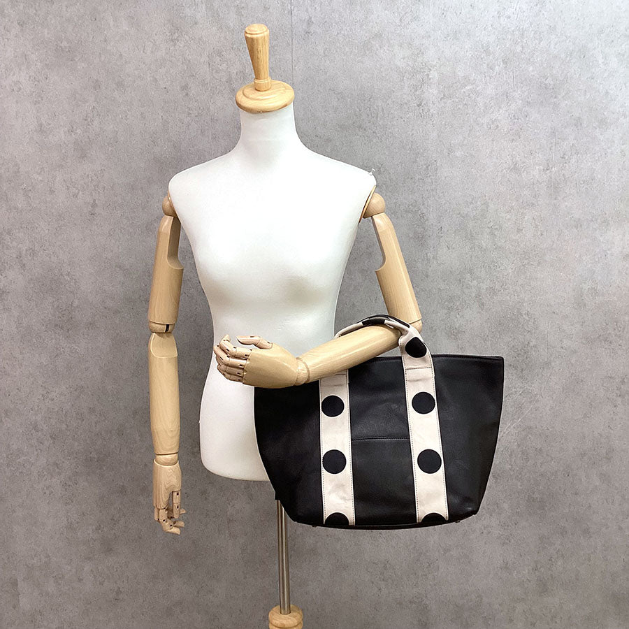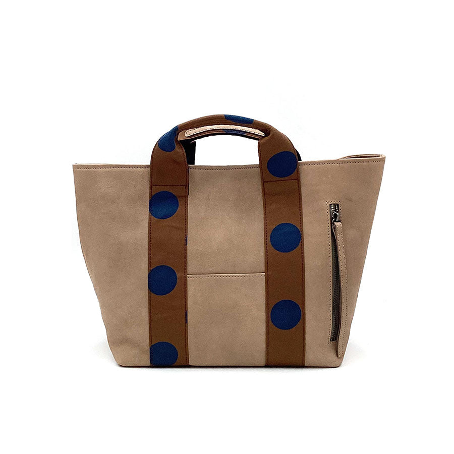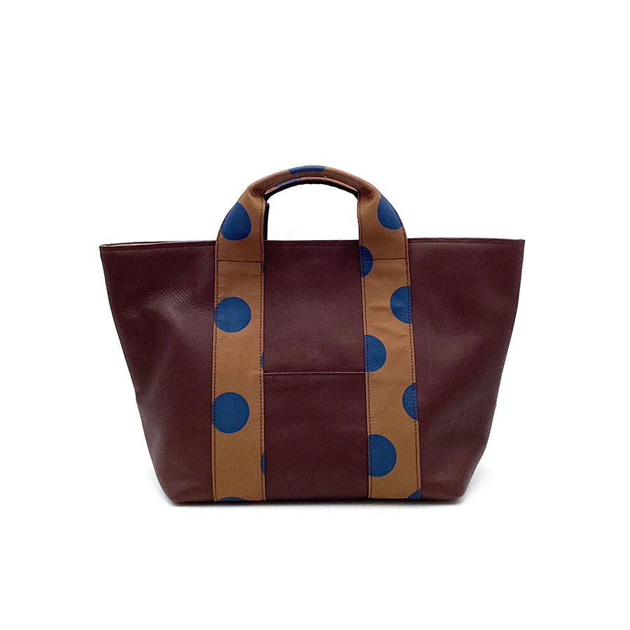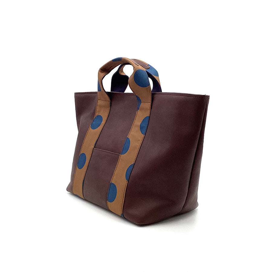 ドット柄テープがアクセントになったハンドバッグ。本体には、マットな質感が美しい牛革を使用。自然な濃淡やツヤ感が楽しめる、表情豊かな素材です。本体をシンプルなデザインにすることで、ドット柄のテープを引き立たせ、カジュアルにもきれいめにも合わせやすいアイテムに仕上がりました。