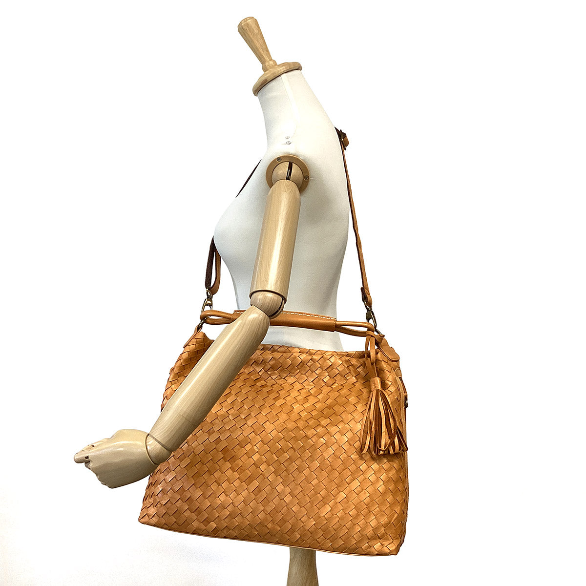 レザー素材の高級感と、メッシュのカジュアルで抜け感のある雰囲気が、カジュアルにもエレガントにも合わせやすいデザインです。ハンドバッグ&ショルダーバッグの2way仕様で、持ち手は肩にもかけられる長さ。LサイズはA4サイズが入るのもポイント。より幅広いシーンでお使いいただけます。
